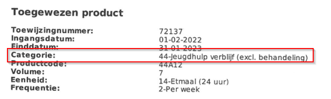 De productcategorie in dit voorbeeld is 44. De omschrijving van de categorie is 'Jeugdhulp verblijf (excl. behandeling).