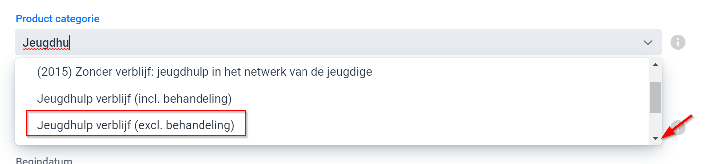 Bij een declaratie via ‘nieuwe aanmaken’ werkt het iets anders. Bij het invoeren van de productcategorie typ je de benaming van deze categorie. Dan verschijnt de juiste categorie. Een andere optie is naar beneden scrollen (zie pijltje).