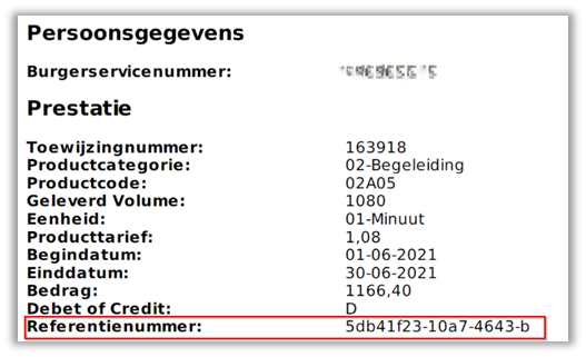 Vul in de kolom 'credit referentienummer', bij elke te crediteren Excelregel, het referentienummer in dat vermeld is in de PDF van de origineel ingediende debet (323). bij deze cliënt-product combinatie. Bijvoorbeeld: “Referentienummer: a1d8786a-35fa-4ace-a”. Deze bestaat uit letters, cijfers en streepjes. Het referentienummer neem je in zijn geheel over, ook de streepjes. Controleer dat er geen spaties voor of na het nummer mee gekopieerd worden. Dit leidt tot afkeur!