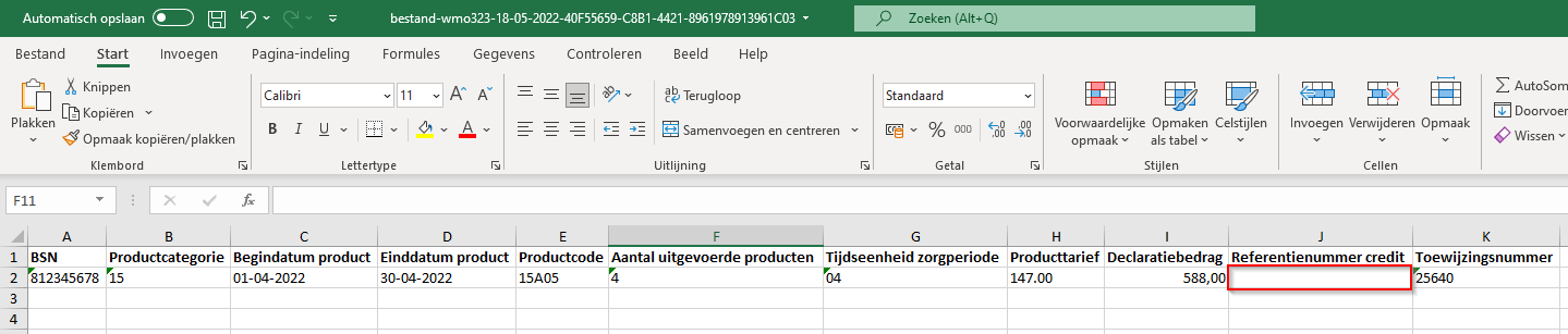 Vul in het excelbestand in de kolom 'credit referentienummer', bij elke te crediteren regel, het referentienummer in dat vermeld is in de PDF van de origineel ingediende debet (323) bij deze cliënt-product combinatie. Bijvoorbeeld: “Referentienummer: a1d8786a-35fa-4ace-a”. Deze bestaat uit letters, cijfers en streepjes. Het referentienummer neem je in zijn geheel over, ook de streepjes. Controleer dat er geen spaties voor of na het nummer mee gekopieerd worden. Dit leidt tot afkeur!